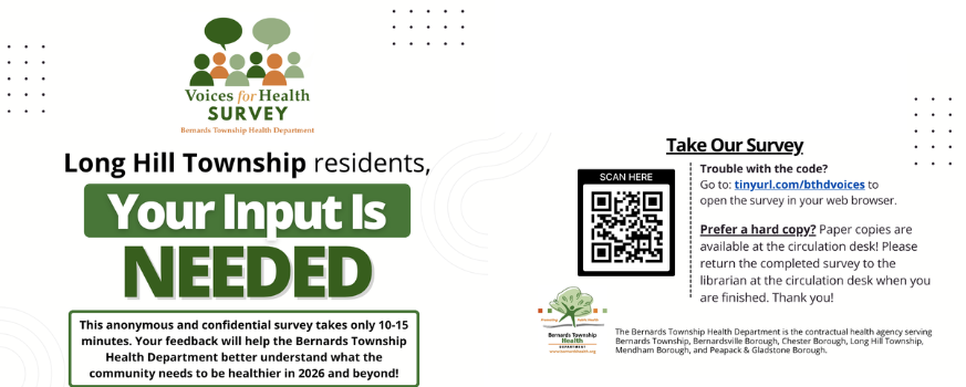 Our local public health department, in coordination with the Long Hill Twp. Board of Health, is seeking your input about the health needs and priorities of our community. We invite you to take 10–15 minutes to complete the anonymous and confidential survey.